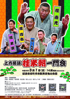 令和8年3月1日(日)午後2時(開場45分前)より、「上方落語 桂米朝一門会」を開催します。桂米朝一門会で、テレビ・ラジオでは味わえない生の寄席の魅力をたっぷりとお楽しみください。